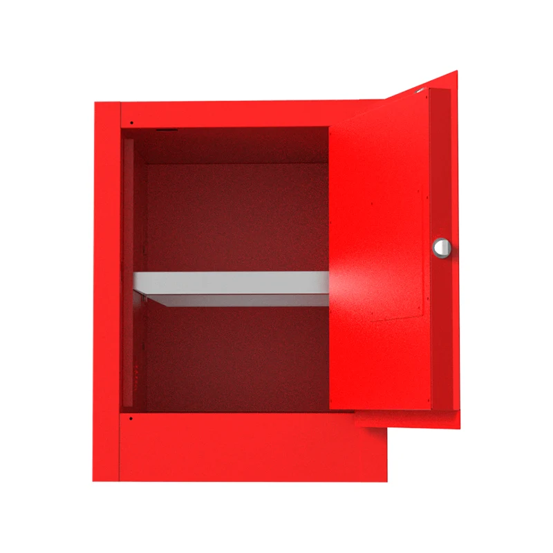 Шафа для безпечного зберігання горючих хімічних речовин складається з двошарової сталевої пластини, що значно підвищує міцність і стабільність корпусу шафи. У промисловому виробництві, коли стикаються з частими переміщеннями та зіткненнями, він може забезпечити надійний фізичний захист для легкозаймистих хімікатів, що зберігаються всередині, запобігаючи потенційній небезпеці, спричиненій витоком легкозаймистих предметів через пошкодження корпусу. Він підходить для таких місць, як склади хімічної сировини.