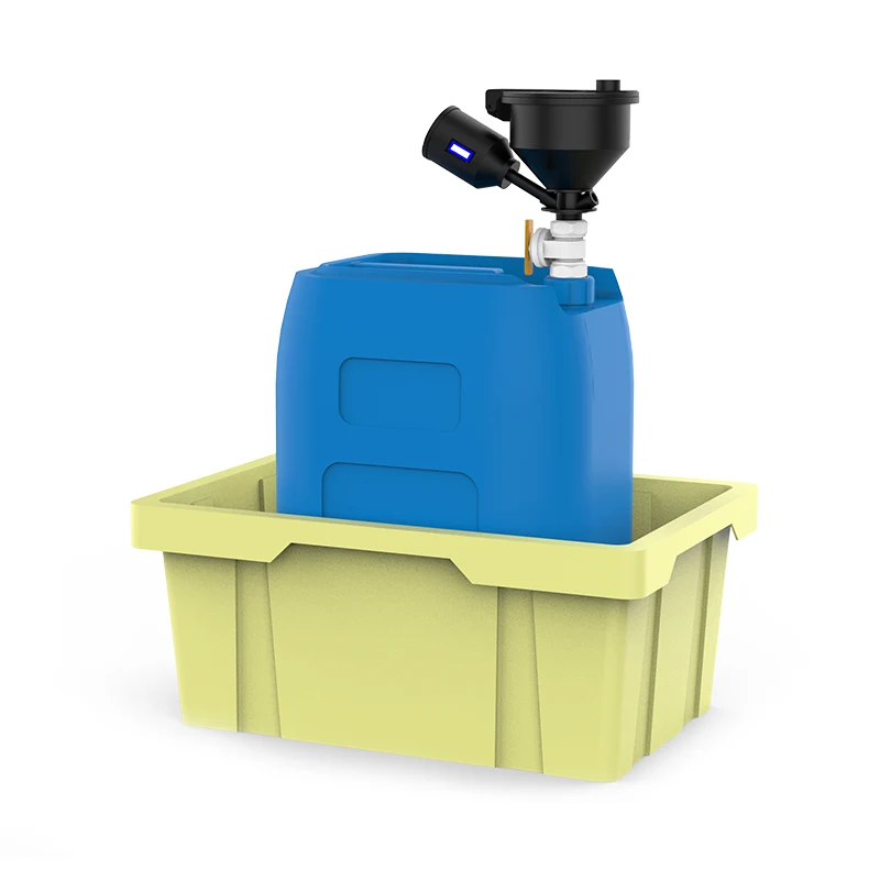 Система збору відпрацьованої рідини оснащена стандартним поплавковим індикатором рівня та антистатичним затискачем заземлення.