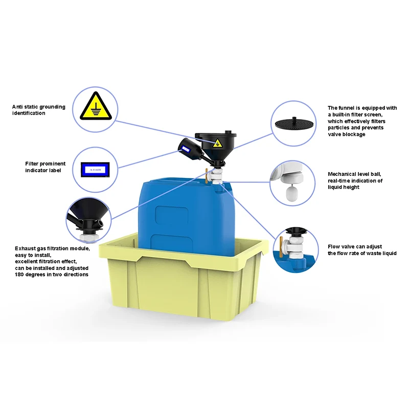 Пристрій для збору стічної рідини має чудові характеристики. Контейнер для збору виготовлений з імпортної антистатичної сировини PP, яка не тільки забезпечує стабільність матеріалу, але й ефективно виконує функцію антистатичного агента, контролюючи статичну електрику воронки для відходів рідини в діапазоні від 10^5 до 10^9, що значно знижує ризик катастроф, спричинених статичною електрикою. Воронка має продуманий дизайн. Герметична верхня кришка поєднується з ущільнювальною кришкою та воронкою фільтра, що захищає від бризок, і за потреби можна встановити клапан для забезпечення безпеки зберігання відпрацьованої рідини. Верхня кришка типу противаги автоматично регулює викид вихлопних газів відповідно до умов внутрішнього тиску відкриття при 100 Па та закриття при 50 Па, уникаючи вибуху та самозаймання. Фільтр відпрацьованих газів підключається по спіралі, що зручно для заміни і запобігає випаровування хімічних компонентів. Доступно 5 різних типів для точної адаптації до різних видів обробки вихлопних газів.